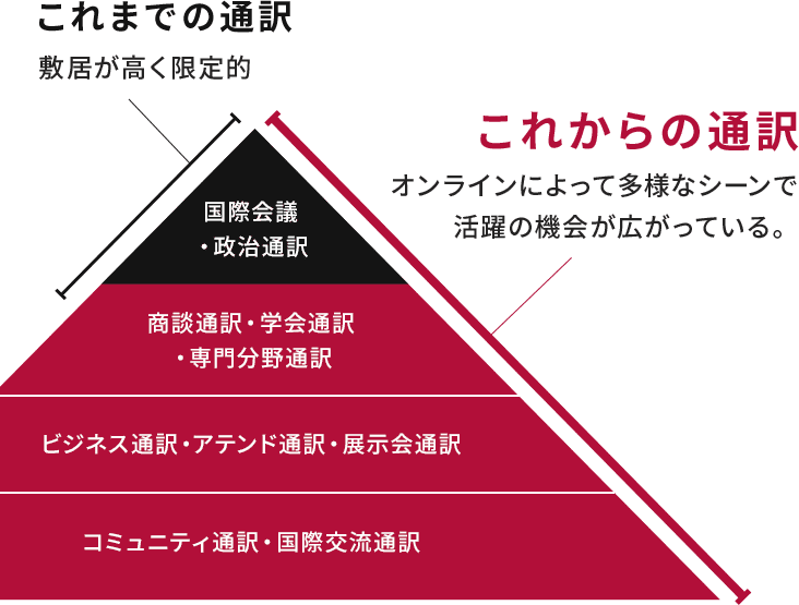 オンラインによる授業で、一般的な通訳スキルに加えて、オンライン通訳の方法も習得できるため、ますます需要が増えるオンライン通訳者の即戦力として活躍できます。