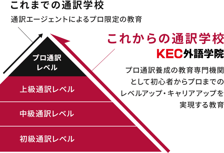 通訳シーンの多様化に合わせ、通訳キャリアも多様化しています。多様なキャリアに応じて、初心者からのステップアップや各レベルに応じた教育ができるのは、プロ通訳養成の教育専門機関であるKEC外語学院だけです。