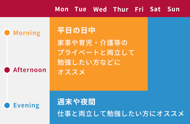 多様なライフスタイルに合わせて、仕事とプライベートとの両立を図りながら、通訳スキルの習得が可能です。